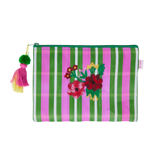 Recycled Plastic Pouch Bag - Flowers - Green and Pink Stripes