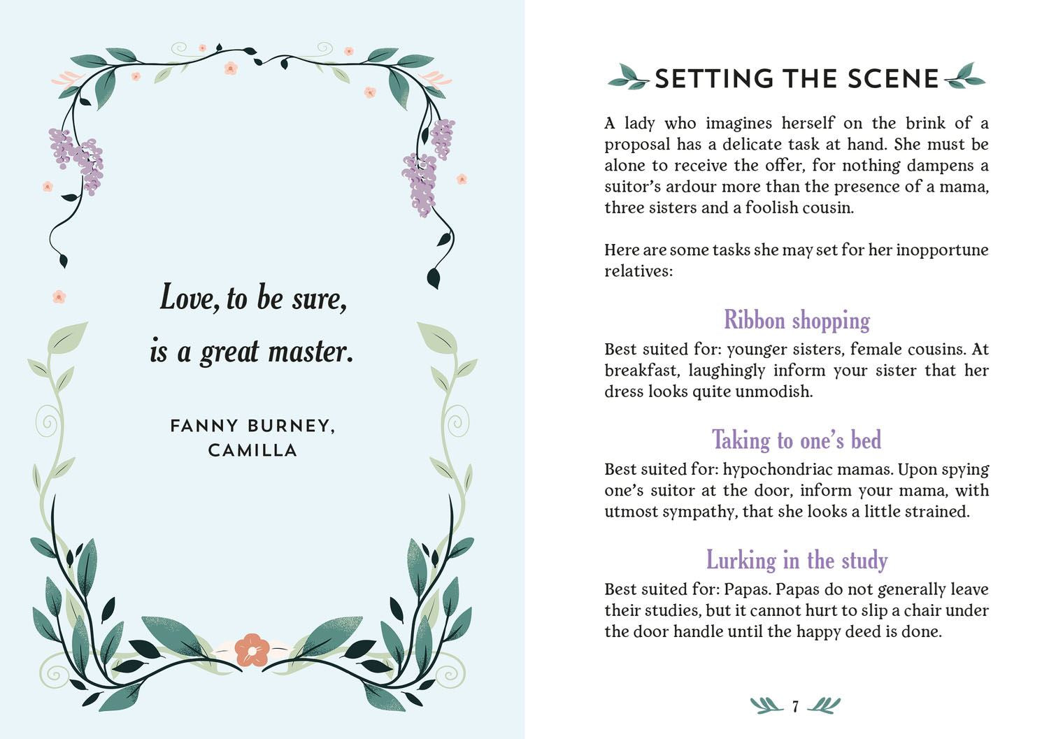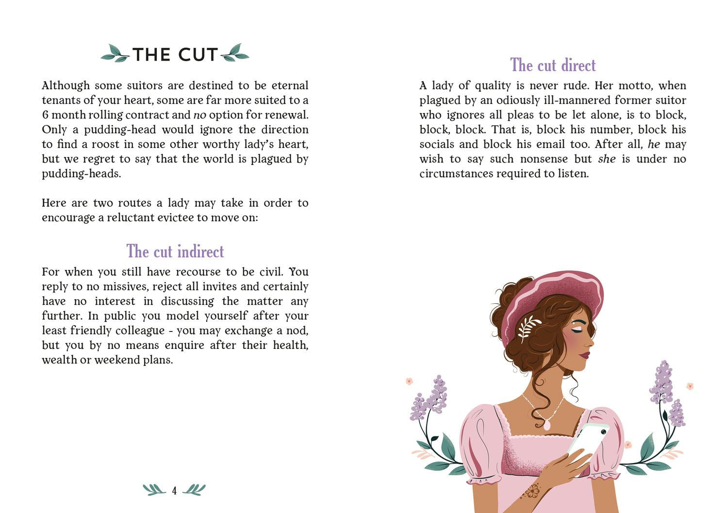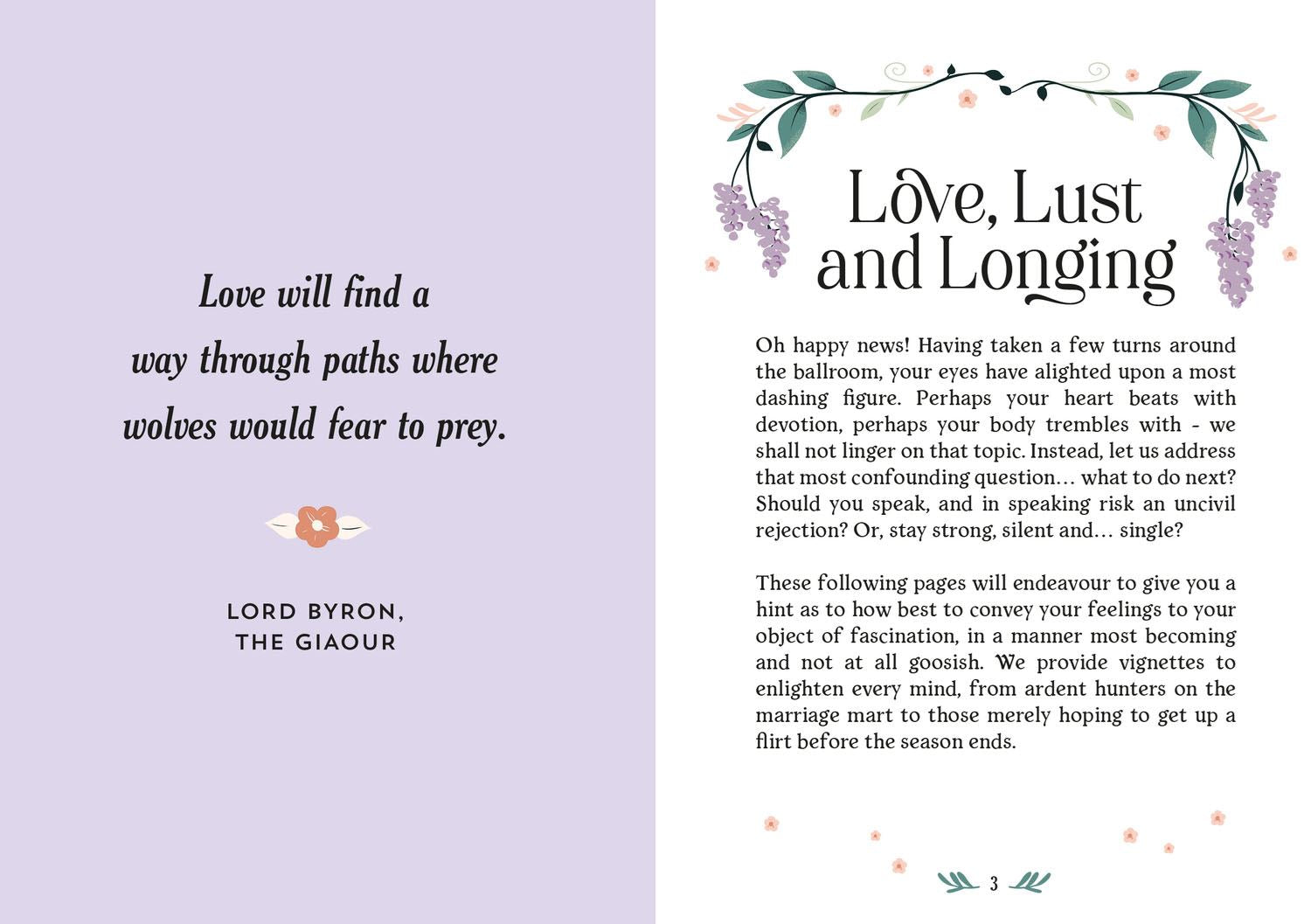 Looking to attract a suitor without the arduous task of swiping through dating apps? Perhaps you have a broken heart that needs nursing? Or maybe an unexpected someone has slid into your DMs and you're unsure how to proceed? Packed with tips for dealing with all kinds of romantic scenarios, and quotations from Regency-era figures like Jane Austen and Lord Byron, this charming, whimsical guide ensures your heart will be ready to swoon. Dive in and discover everything you need to face the world of love and courtship.