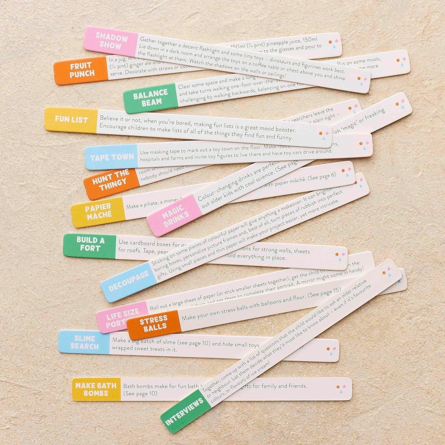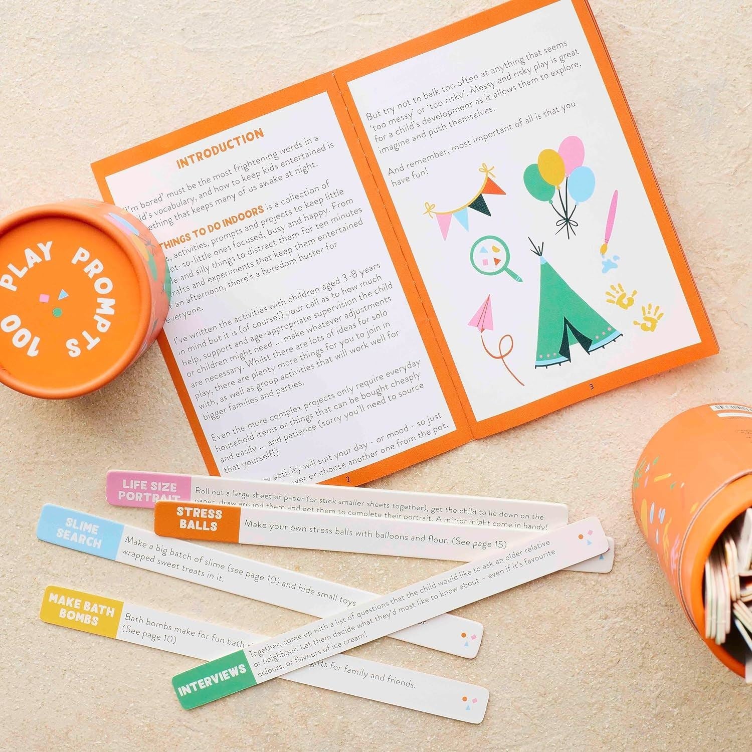 A collection of games, activities, prompts and projects to keep little and not-so-little ones focused, busy and happy. Pick a play prompt strip to give you all the inspiration you need whether you're a parent, a grandparent, a childcare worker or simply the one in charge of a child for a day. From simple and silly things to distract them for ten minutes to crafts and experiments to keep them entertained for an afternoon, there's a boredom buster for everyone. If you don't know how to make rainbow crayons, a calming jar or bath paints, no problem. There's a handy booklet with all the instructions you'll need for all sorts of projects.